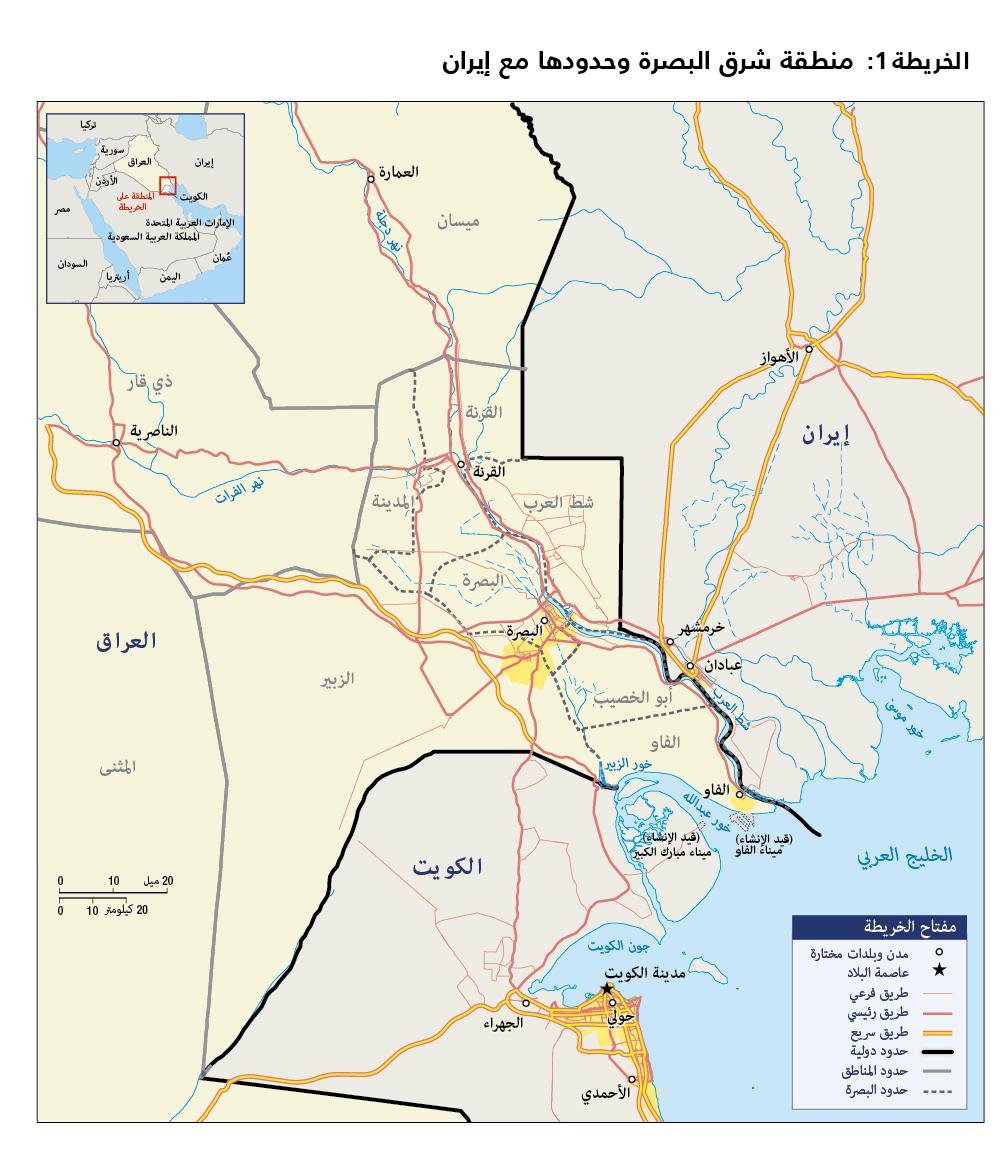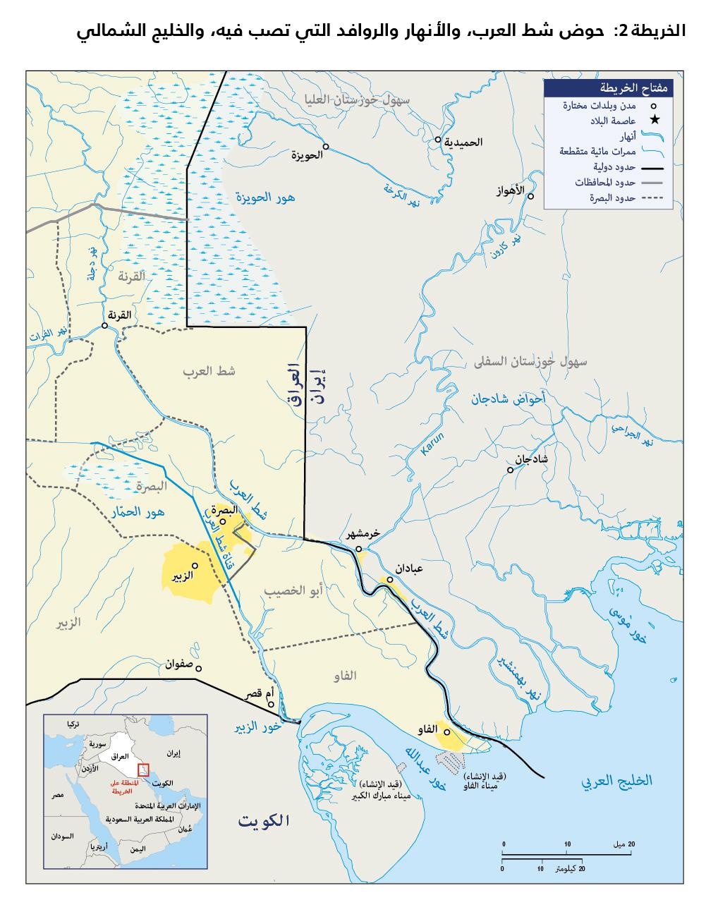 ساهمت عوامل عدة في هذا الوضع، منها تغيّر المناخ والارتفاع الإجمالي في درجات الحرارة العالمية.2 لكن النشاط البشري كان مدمِّرًا بشكل حاد، ومن مظاهره الخلاف الطويل بين بغداد وطهران على الأراضي والموارد المائية قرب الحدود، وغياب التنسيق والمقاربة المشتركة العابرة للحدود في مجالَي الحوكمة وإدارة المياه (انظر الخريطة 1). فقد ساهمت النزاعات بين العراق وإيران، وتركيزهما على الأمن، وسياساتهما المركزية، وسعيهما إلى فرض هيمنتهما في مراحل مختلفة، في سوء الإدارة المنهجي أو في إهمال المناطق المحيطة بالبصرة والتي تتصف بطابعها الطوبوغرافي الفريد من نوعه. وإضافةً إلى ذلك، تسارع التدهور بسبب اعتماد سياسات غير مستدامة بيئيًا موجّهة نحو الإنماء، وتتمثل بصورة خاصة بالتحوّل نحو اعتماد الإنتاج النفطي كمصدر الأساسي للدخل والعنصر الرئيس الذي يُحدّد أهمية المنطقة.