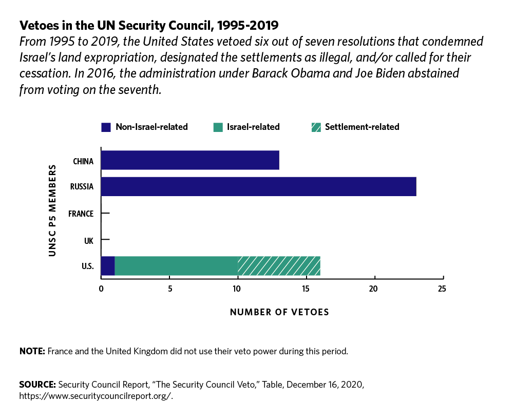 • Uphold international law and United Nations (UN) resolutions on the Israeli-Palestinian conflict by refraining from using U.S. vetoes at the UN Security Council and working cooperatively with UN agencies and other multilateral mechanisms in support of the recommendations outlined here.