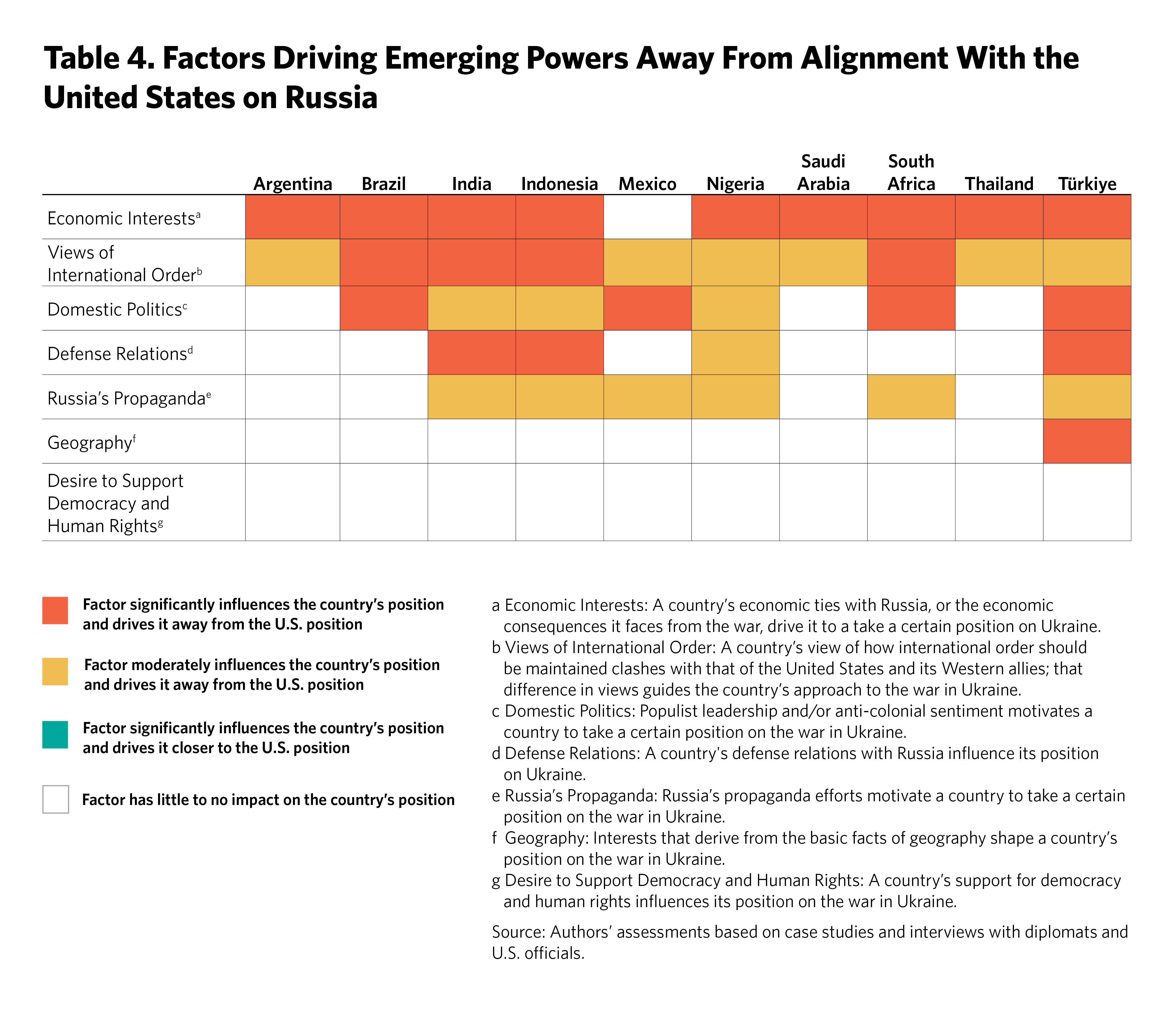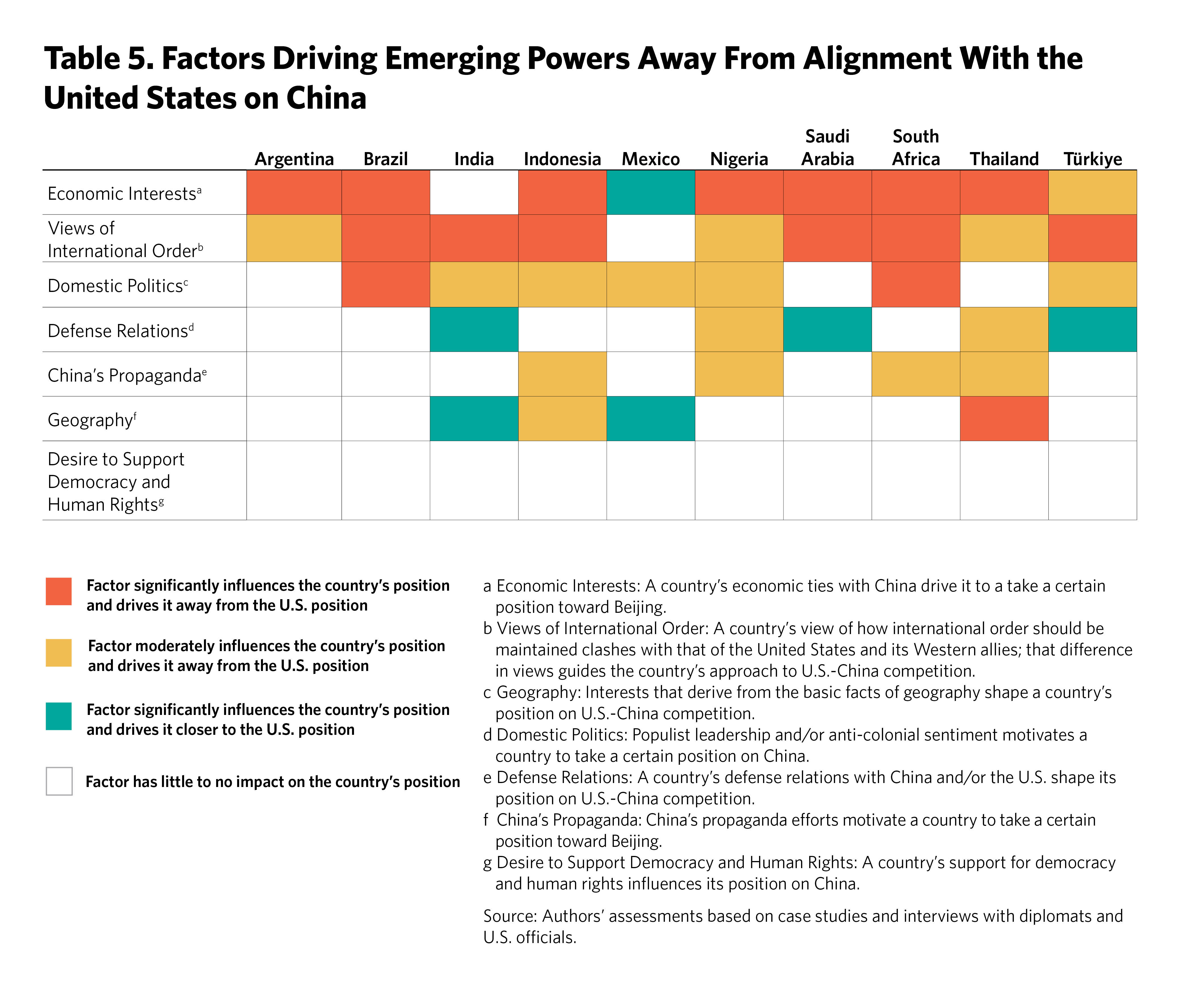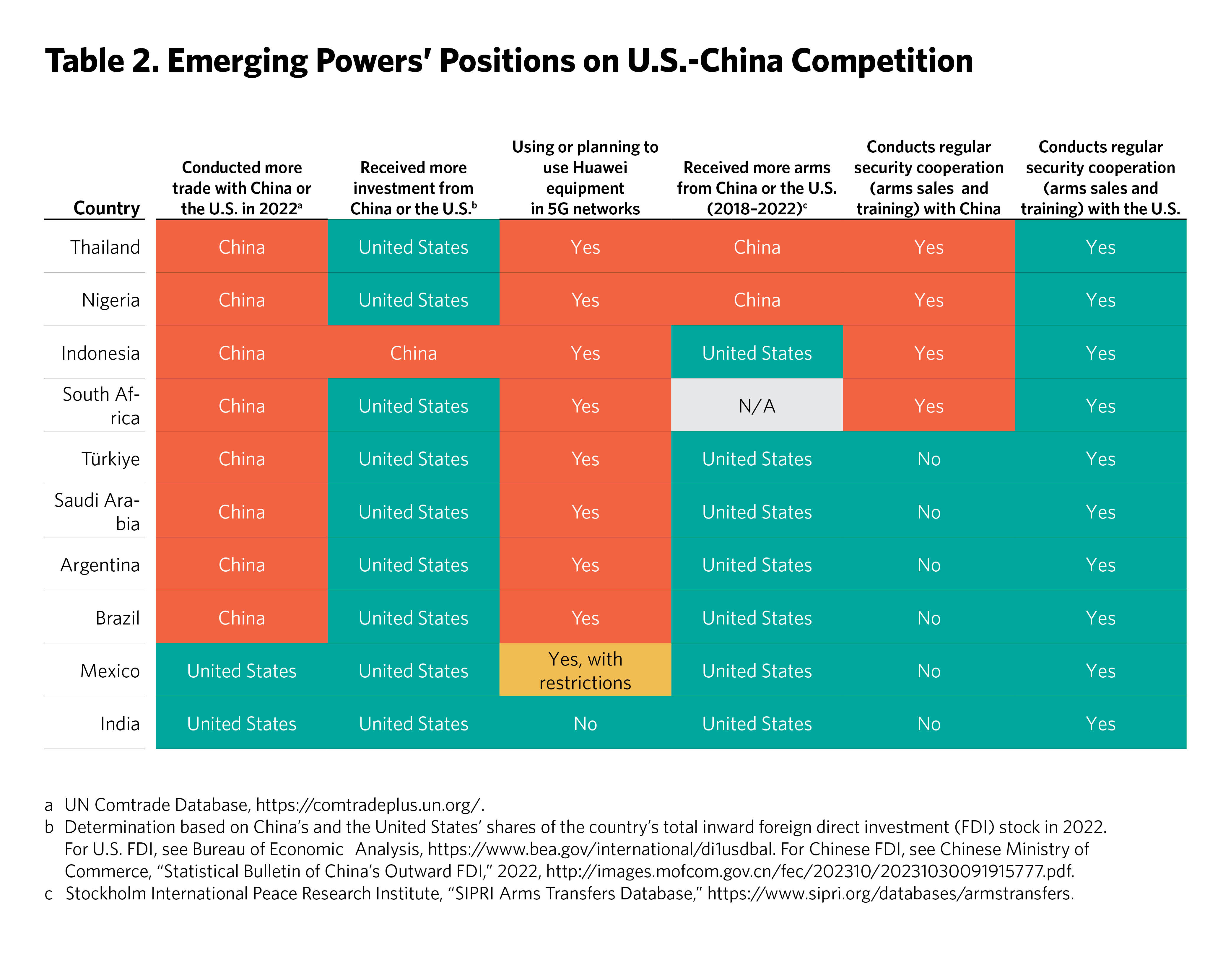 Table 2 shows the emerging powers’ alignment on U.S.-China competition across indicative measures; India is most closely aligned with the United States (indicated by an entirely green row).